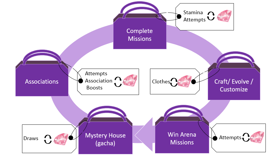 Gachas also have shops attached to them that act as hedging mechanics. These Shops introduce new types of currencies: