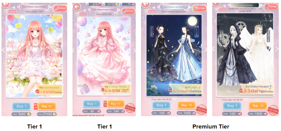 - 1st tier is purchased for Gold Coins (soft currency) with 1-5 rarity clothes;
