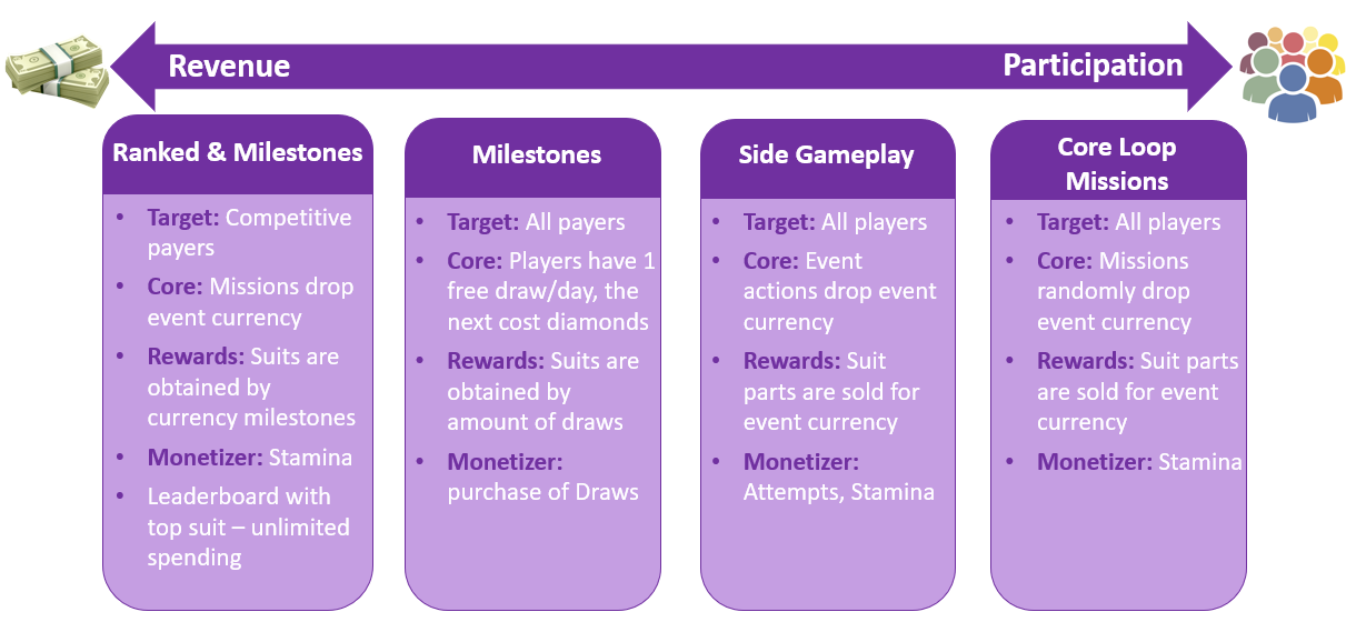 Normally, each event will push different parts of the core loop and boost the top sellers even more. They will almost always rely on a new energy and a new event currency, making their balancing that much simpler while keeping everything clear.