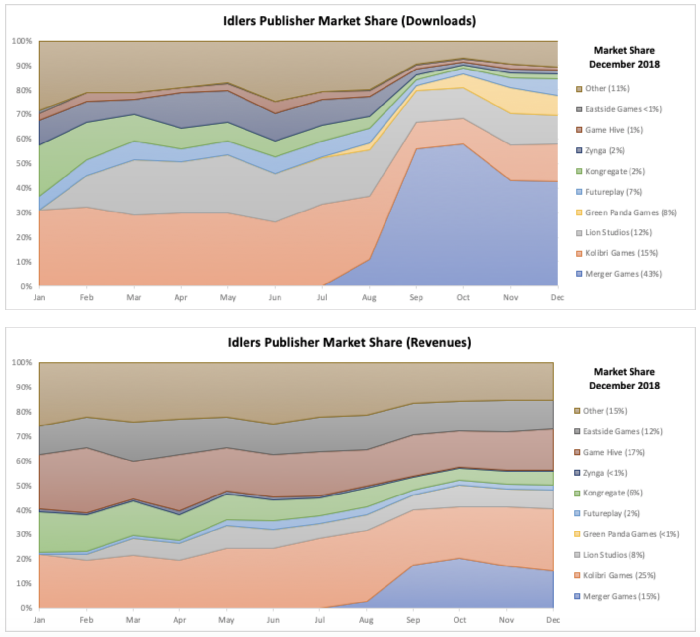 The Idler market has greatly matured over the years, but not without some market share movements due to new players entering the market. Merger Games made the biggest dent by eating away downloads market share from 2018’s Idler poster child - Kolibri Games (previously known as Fluffy Fairy Games). Further, in a portfolio diversification effort, Lion Studios also took a shot at the market with two new idle game launches in the year, “Cash Inc.” and “Hooked Inc.” - ending the year with a 10-15% downloads share. At the same time, Lion has been experiencing slower downloads growth rate in the genre over the year, indicating that it might make a move in 2019 to hold or grow its market share with new Idler launches. Futureplay, Zynga (Gram Games) and Idler veteran Kongregate all quietened down over the year due to ageing portfolios, while Game Hive sustains strong revenues with “Tap Titans 2”.