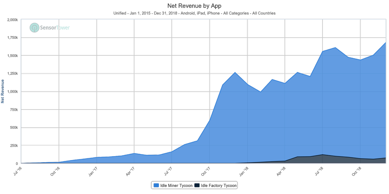 Kolibri continues to dominate the sub-genre with a 25% IAP revenue share driven by its smash hit “Idle Miner Tycoon”. Not to mention how Kolibri has inspired developers globally with their incredibly agile production processes and live-op techniques to grow a game’s users and revenues through small consistent improvements over rapid release cycles. While “Idle Miner Tycoon” continues to grow revenues over stable download volumes, Kolibri hasn’t been able to strike gold twice with their second title “Idle Factory Tycoon”, yet! With “Idle Miner Tycoon” entering its third year of existence and Kolibri experiencing its first QoQ revenue dip in Q4 2018, there is a good chance of 2019 bringing increased pressure on the team to either launch a third title or majorly turn around “Idle Factory Tycoon”. We shouldn’t forget how “Idle Miner Tycoon” also started small, and took little over a year to become the monster it is today but with a state of the art production methodology. Check out Kolibri’s GDC 2018 lecture for more details on their “state of the art production model”.