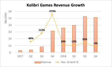 Jelly Button Games (“Pirate Kings”) - at $2-2.5m per month during Q4 2018 (annual revenues +375% YoY), and is poised to break into the Top 150 grossing games list