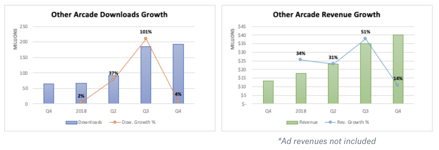 While Battle Royale games made the loud splash during 2018, the Arcade games grew their revenues at triple digit speed becoming the second most grossing category in Casual Games.