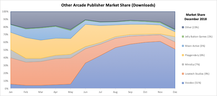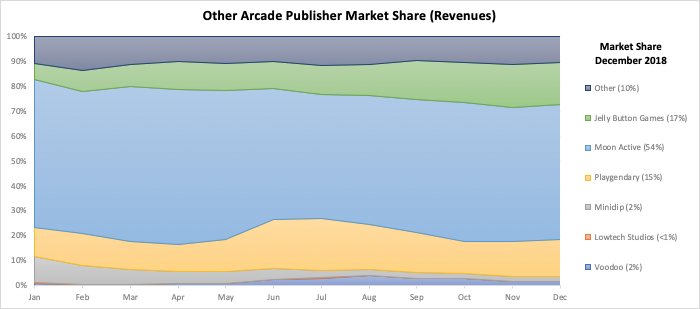 Voodoo’s new game launches have brought it back in this sub-genre as a market leader with more than 50% downloads market share. Clearly, it has also contributed to massive market growth, while leaving other publishers like Playgendary and Lowtech Studios with minor market shares by the end of the year.