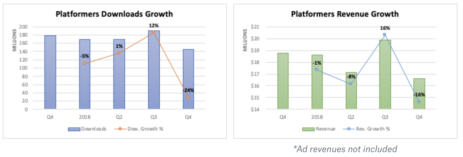 As the second largest sub-genre by downloads (20% ) and tied in second position by IAP revenues with Hyper-casual and Idlers (20%), Platformers did not see a very eventful year. With only one major new release in the year (“Will Hero” by ZPLAY) that caused one-fourth of the Q3 2018 downloads and revenue spike, this sub-genre has remained relatively dry.