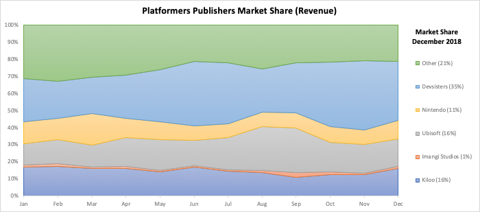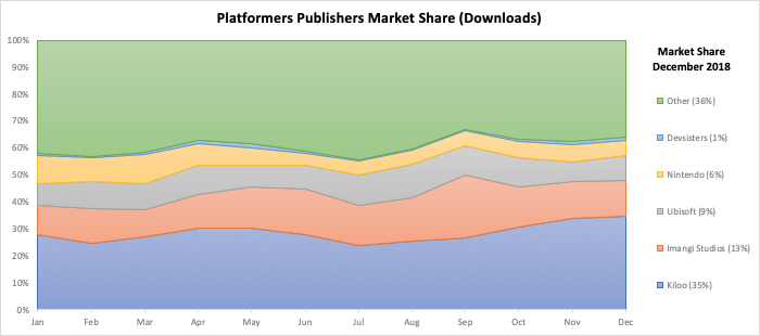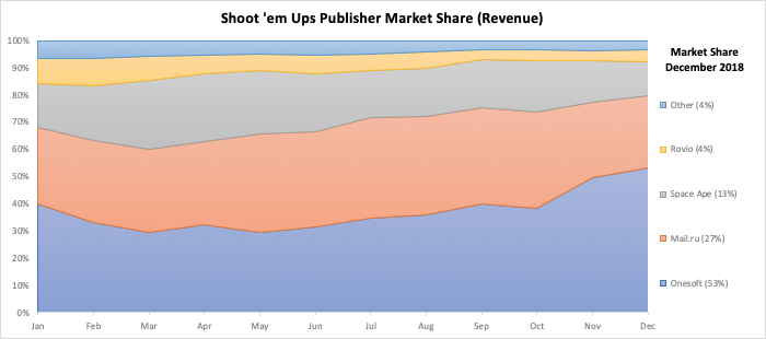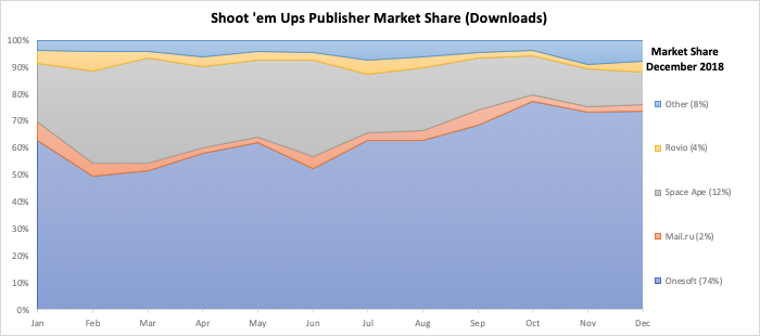 Onesoft is the clear market leader on both downloads (70-75% share) and revenues (50-55% share). Their portfolio focusses on Shoot ‘em Ups and their flagship title “Galaxy Attack: Alien Shooter” soared in 2018 (annual revenues at $11m, +500% YoY), and continues to grow. More growth imminent in 2019.