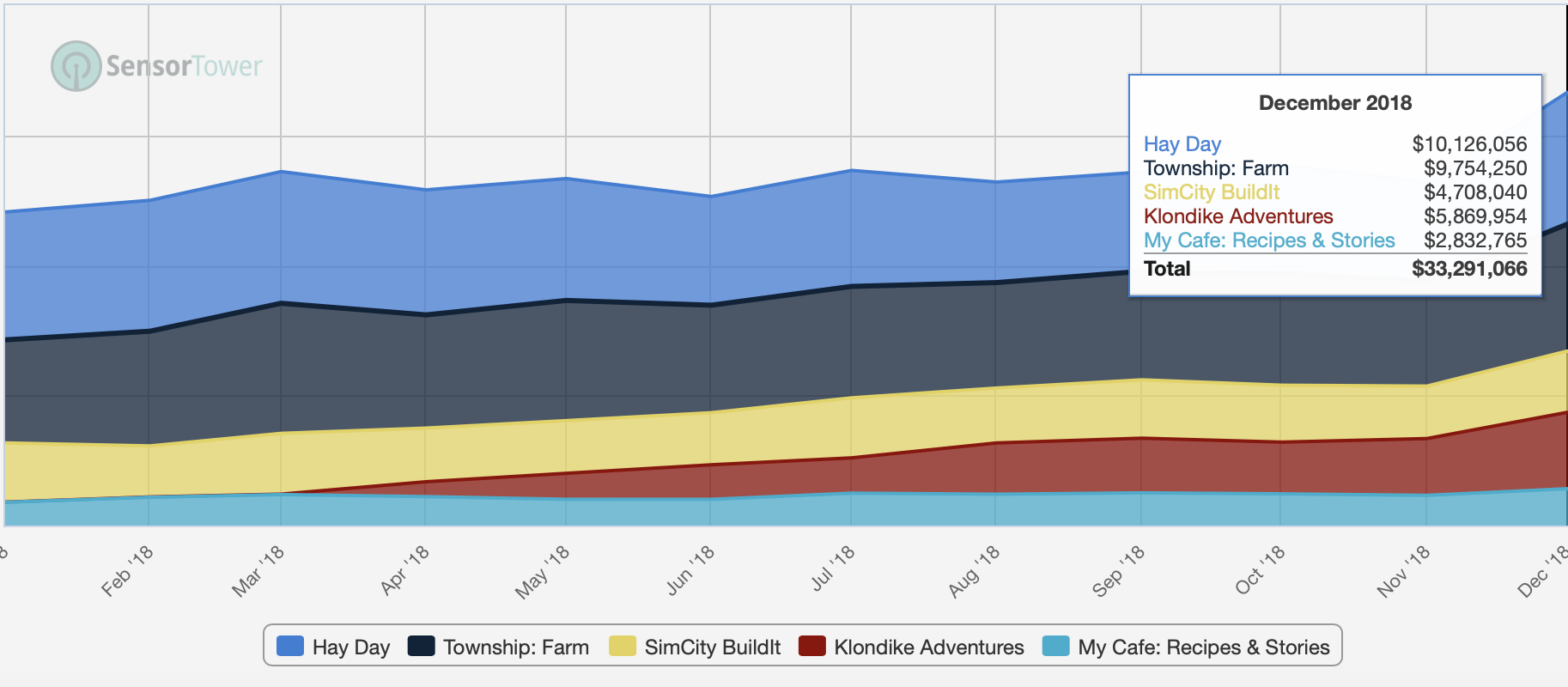 For years now Hay Day used to be the sub-category leader. In 2018 this changed. Hay Day’s year-over-year revenues declined by over a dozen percent while Township kept its run rate steady to take over the sub-category leadership some 7 years after the game was initially launched on Google Plus (!).