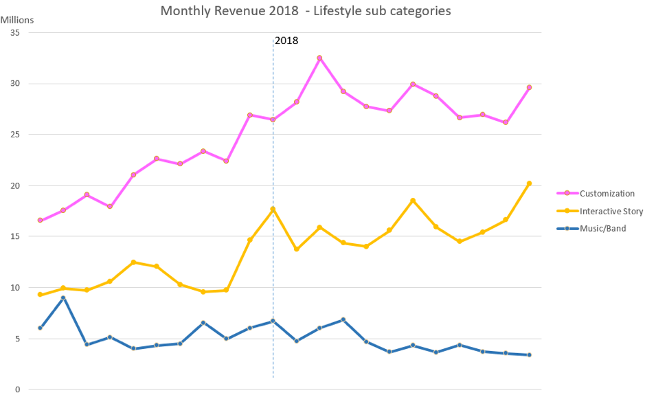 The gap between Customization and Interactive Story games will increase further as Customization category evolves with more robust features.