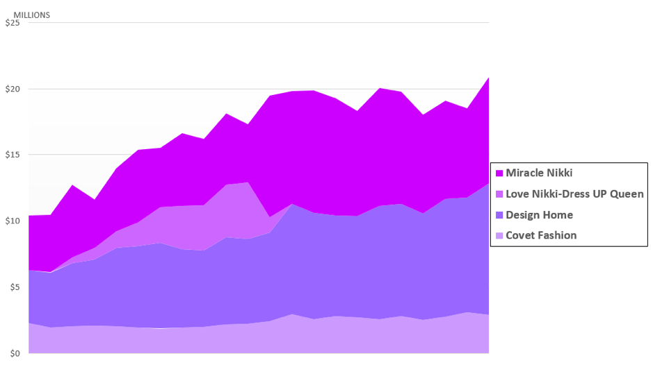 Design Home isn’t the only dominant game in the Customization sub-category though. Tencent’s Miracle Nikki or Love Nikki as it was called before doubled its run-rate in the West.