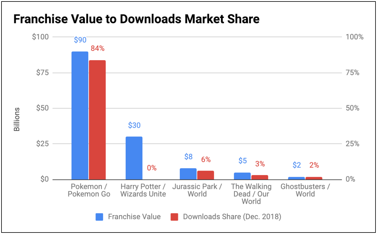 There are a couple of interesting macro data points that could correlate with Pokemon Go succeeding where everyone else seems to have failed. And maybe studying these gives us a peek into what's to come in 2019. First - In terms of estimated franchise value and therefore scale/reach, Pokemon is by far the leader of the lot - not to mention that Pokemon is arguably one of the most valuable media franchises in the world. Surprisingly enough, the various franchise values follow a similar trend to the December 2018 downloads share of their respective LBGs, as can be seen in the graph below.