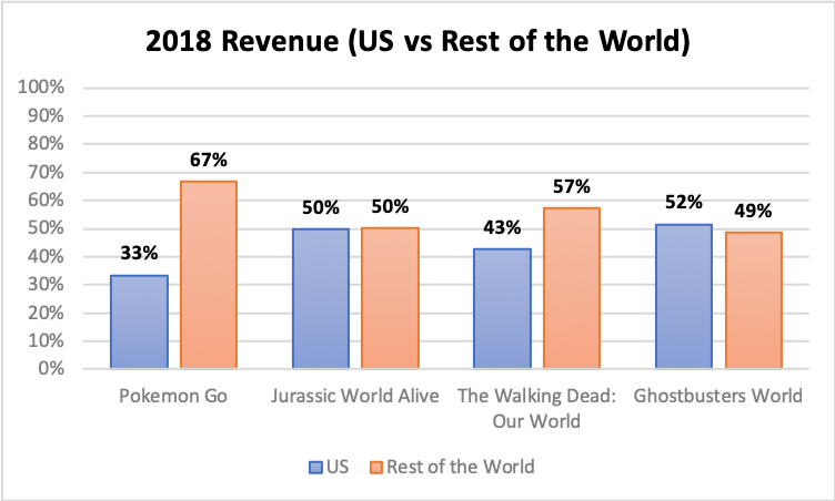 The more even interest spread is directionally confirmed with Pokemon Go seeing healthier distribution of downloads across the world (only 16% downloads coming from US) compared to the other IPs that are more skewed towards the US. On the revenue side of things, Pokemon Go rakes in only a little above 30% of its revenues from US, while Japan brings in another 30% and the remaining 40% is driven by the rest of the world. The other LBGs see half of their revenues coming in from US.