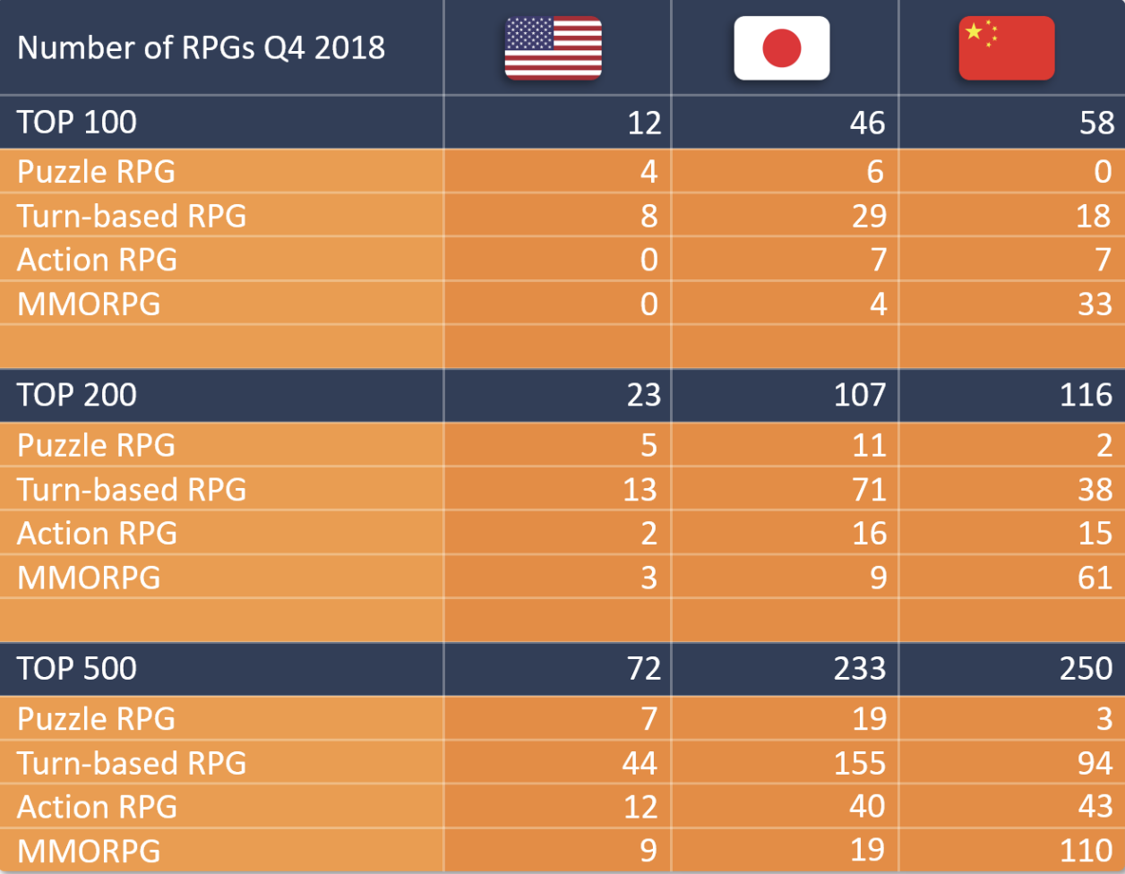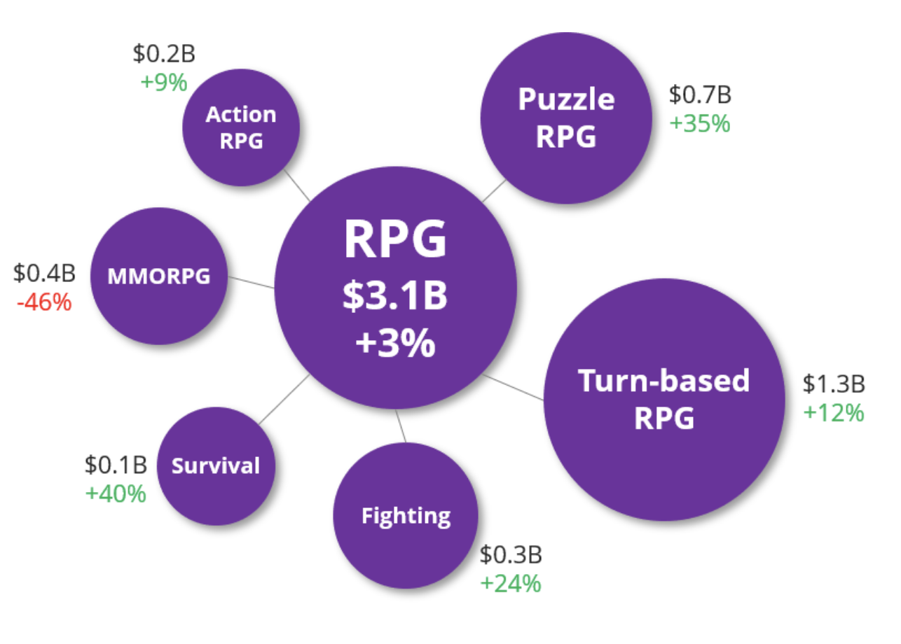 Turn-based RPG was the only RPG sub-genre with all of its top 5 titles in the overall top 100 grossing. It is still the most accessible RPG game type in the West and Japan and second most popular RPG game type in China.