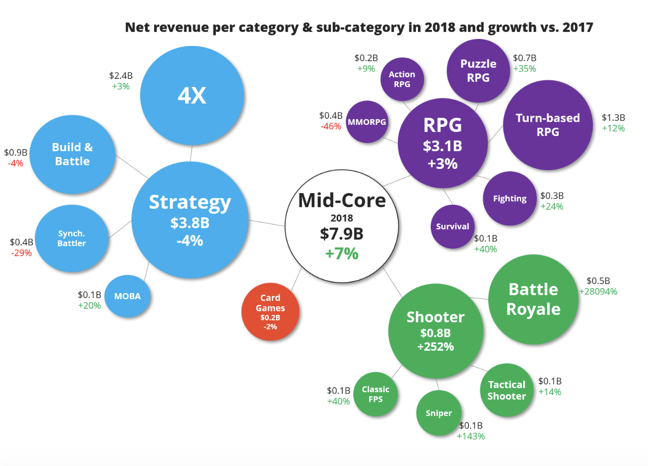 The mid-core market grew by 7% in 2018. The main bulk of growth was driven by Battle Royale and Puzzle RPG and Fighting Games while the biggest losers were Synchronous Battlers (aka. Clash Roayle) and MMORPG (aka. Lineage II)