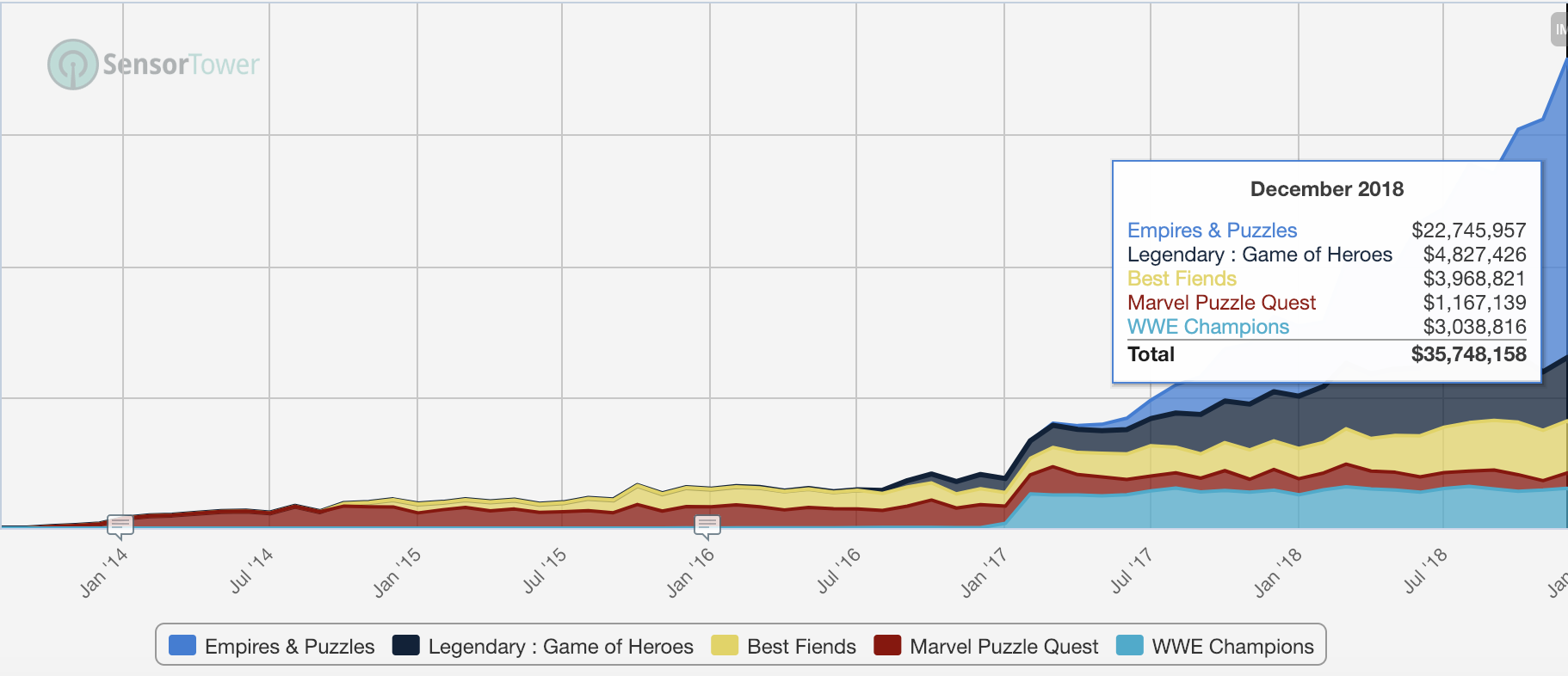 Then in 2014 we saw first glimpse of light as Marvel Puzzle Quest launched with decent sustained performance. Just like with card battler a couple of years before, Marvel made the complex games more accessible with their giant recognisable roster of heroes. A year later Best Fiends came out with their original IP targeting female first audience with a lot more accessible core and meta-game. Then WWE Champions and Legendary launched. These two quickly tripled the market size in 2017. But the true Cinderella story has been Empires & Puzzles from Small Giant Games, which turned rapidly growing sub-category into a hockey stick.