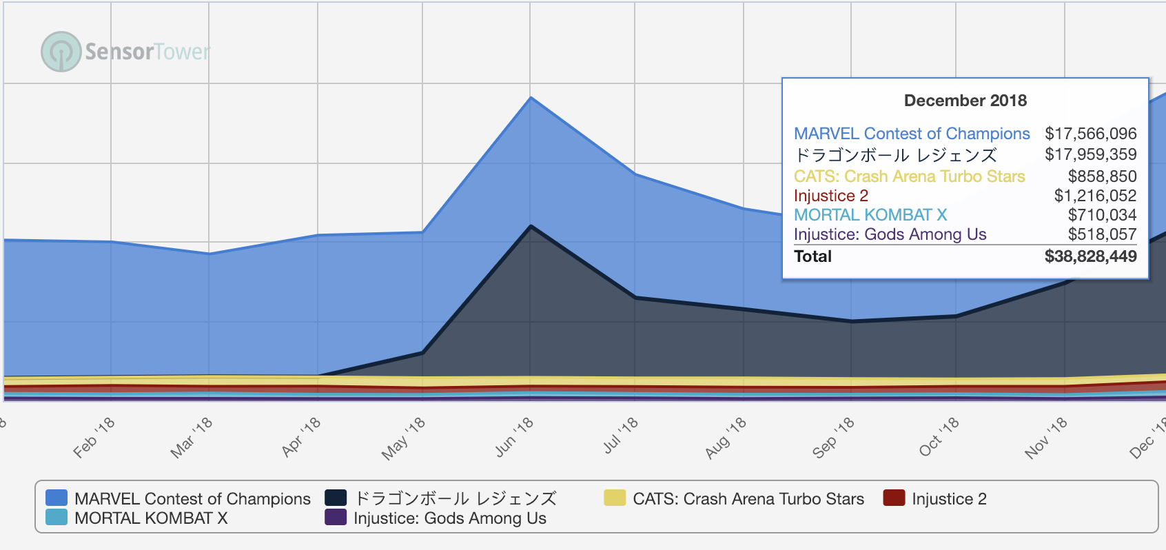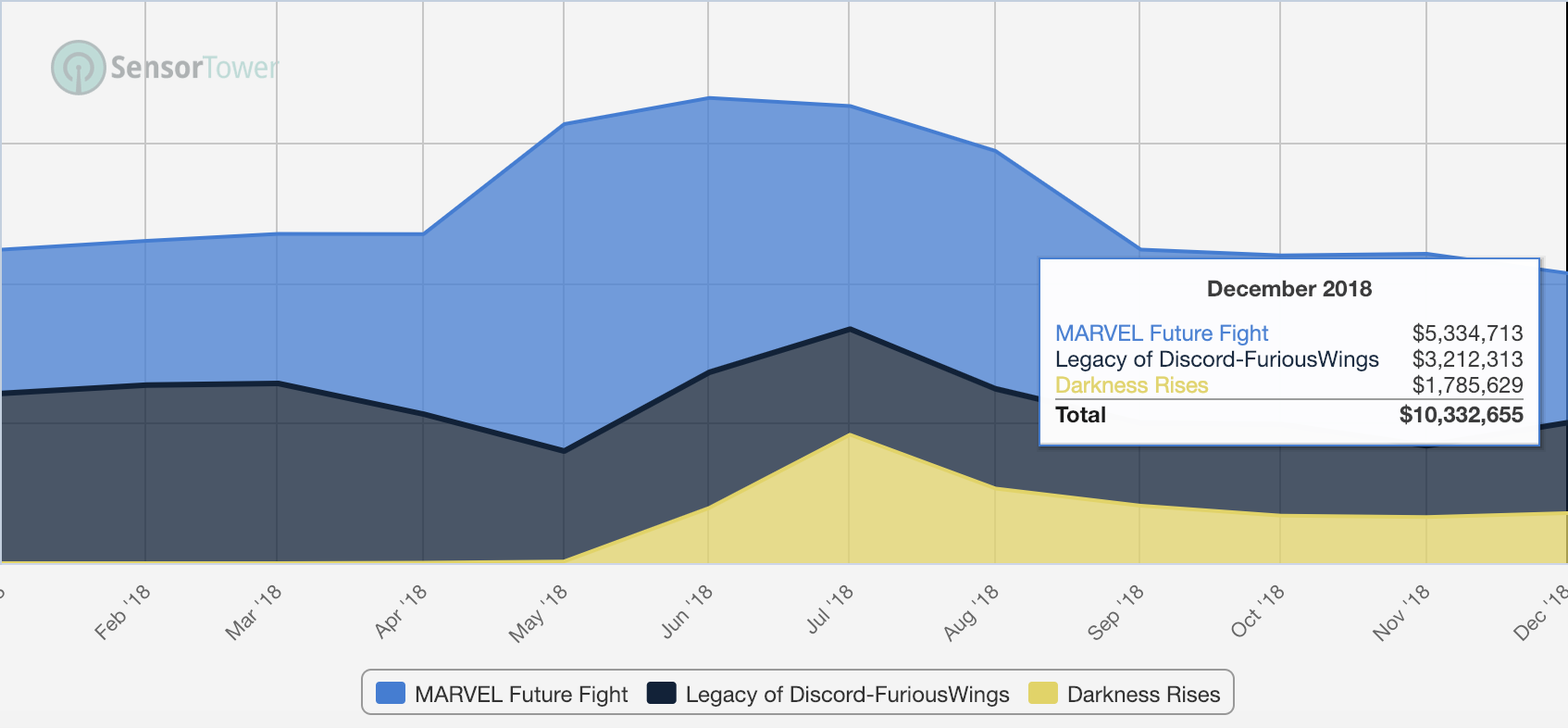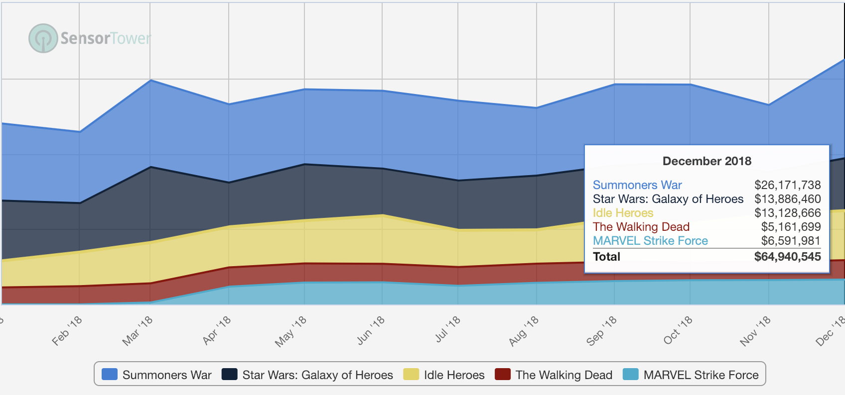 Given the popularity and incredible monetisation of the top games, entering the top in this sub-category is nearly impossible. But only nearly, as Marvel Strike Force proved launching in the first half of 2018 and quickly climbing to the top. At one point the game appeared to be taking a good chunk of Star Wars Galaxy of Heroes and Summoners Wars monthly revenues (see the graph below).However, as the months passed, the game found its own audience and the whole pie actually grew towards the end of the year.