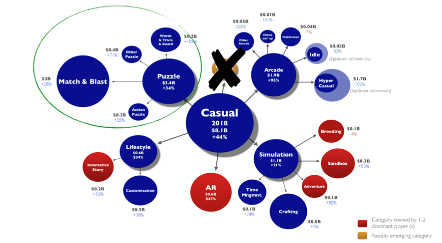 Puzzle is the biggest category on mobile while Match & Blast games is the biggest sub-category with $3Bn in 2018 revenues and almost 30% year-on-year growth.