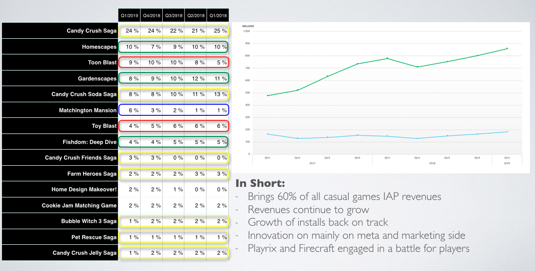 Match & Blast games is the biggest sub-category on mobile with $3Bn in net revenues in 2018 and a year-on-year growth of revenues at whopping 28%. This sub-category has traditionally been dominated by King. And yes, King still is the dominant player with its forever-franchise Candy Crush Saga. The hard fact is that King has struggled to keep up with the growth of the category, losing pieces of its dominating market share year-after-year to new competitors. These new competitors have grown into contenders and are on a pace to become rivals. These future rivals are Playrix, Peak and as of late, Firecraft Studios.