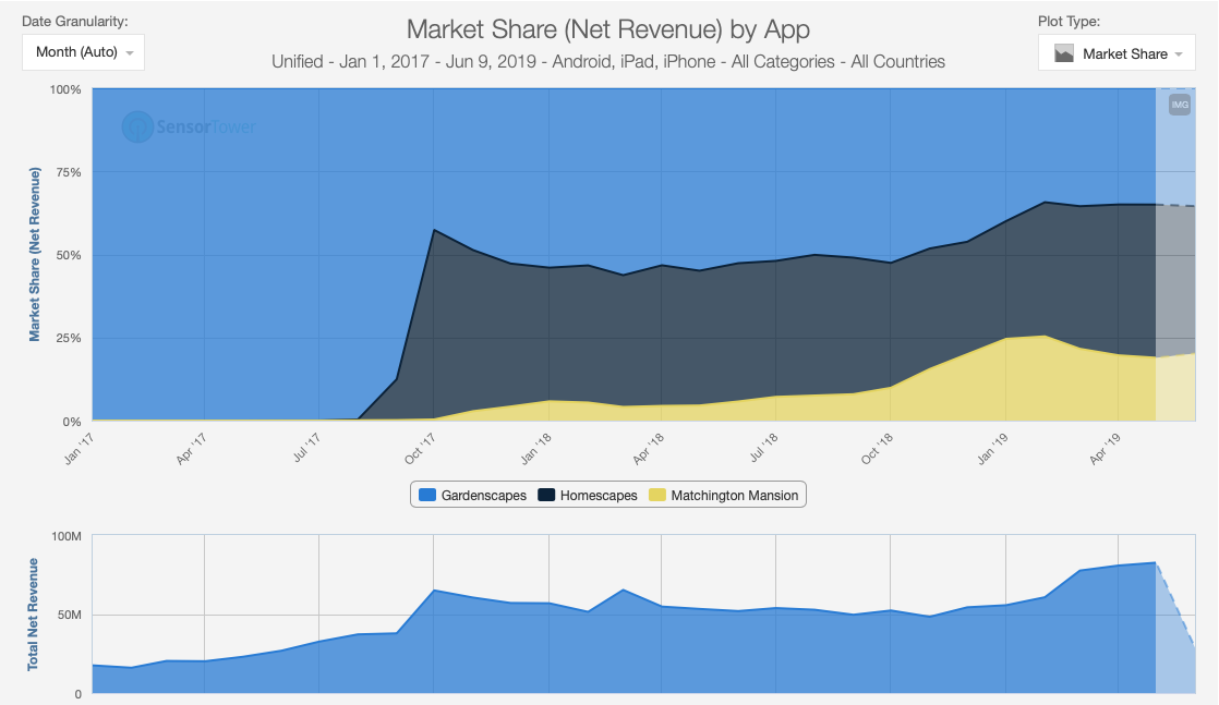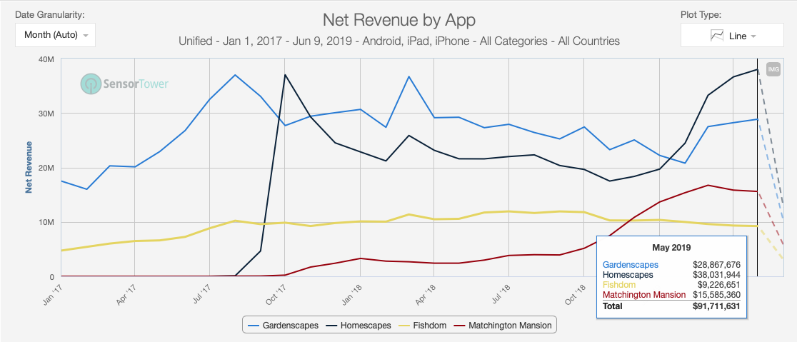 Matchington Mansion isn't the only game trying to take a bite out of Playrix' apple; Family Zoo (Plarium, Aug 2017), Home Design Makeover (Storm8, Feb 2018) and My Home - Design Dreams (Zentertain, Aug 2018) have been making attempts, but have all reached nothing but a fraction of what Firecraft Studios has accomplished. Newcomer Lily’s Garden (Tactile Games, Jan 2019) even uses a different core-game (tile-blast instead of match-3) with the same visual progression and narrative driven progression.