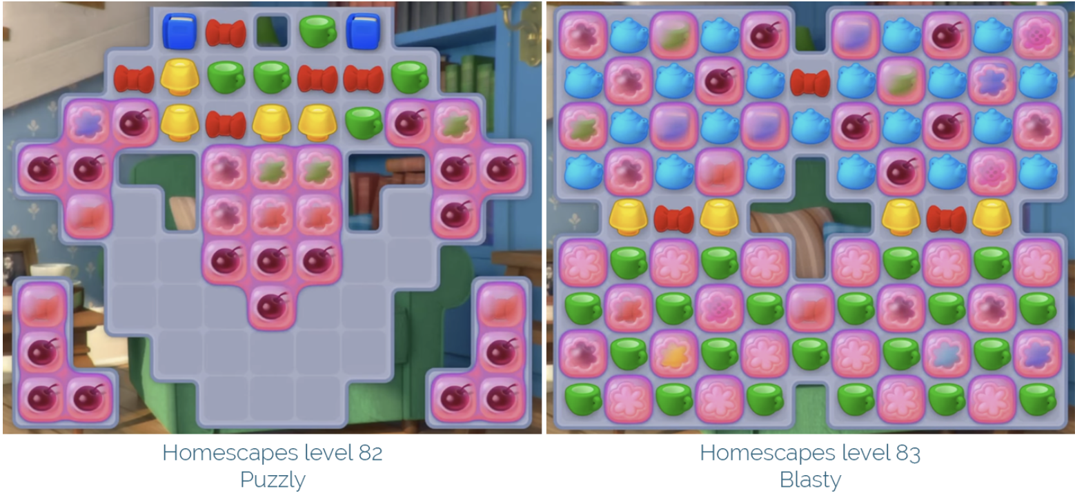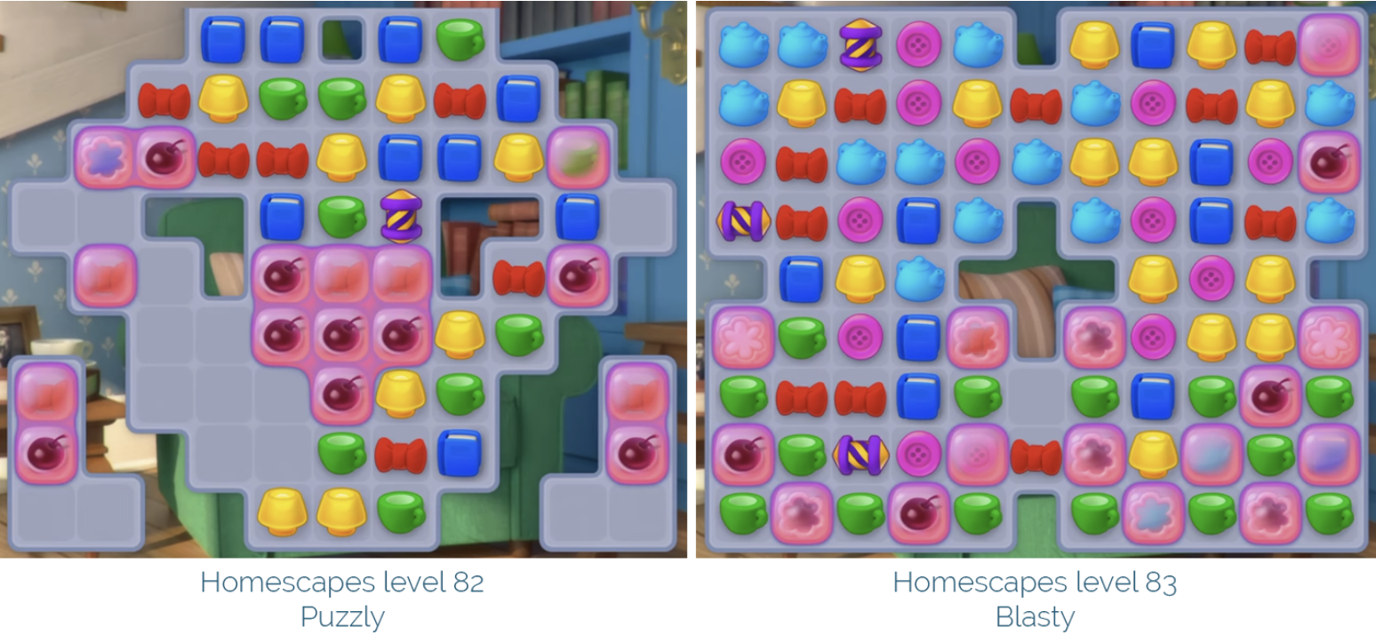 For the average match-3 player, “blasty” levels like level 83 involve a much more attractive play style, psychologically. There is less thinking involved since it matters less which exact supergems are created (all of them will do).