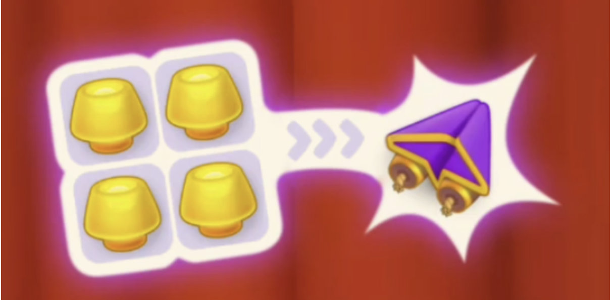 In Homescapes, this match results in an airplane gem. When matched, the airplane flies to a pseudo-random spot anywhere on the board to explode in a plus-shaped manner, always targeting a useful objective in the level. This is a common technique used in level design to give the player some influence on what happens elsewhere on the board or break up possible “dead areas” without matches. Because Matchington Mansion’s levels require less tactical hitting of faraway objectives, the game’s designers decided they don’t need this behaviour, which is why Matchington Mansion’s variant of this supergem doesn’t fly before exploding.