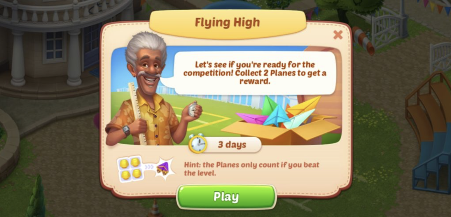While in 2018, Playrix has been struggling to create meaningful and deep events in their game, Matchington Mansion again has taken more initiative. In Homescapes, one kind of event has been a competitive tournament with leaderboard rewards. While playing levels, performing as many specific actions (e.g. matching to create airplane supergems) as possible ranks players against each other so they can compete for rewards. Nothing revolutionary from a live-ops perspective and not very interesting for non-competitive players.