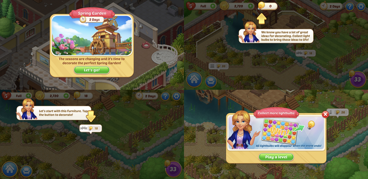 Another type of event in Homescapes is the one they call ‘Furry Tales’. It’s an 8-level saga-style sequence of levels where players need to reach and win the 8th level without losing 3 times. This one has been successful, leveraging your game’s core gameplay and a sequence of specifically catered levels is never a bad idea. Original? Not so much.