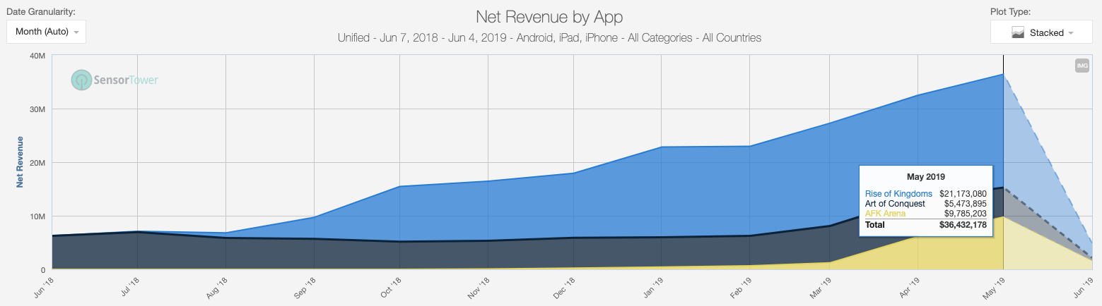 Lilith is a company you may be familiar with. Founded in 2013 in Shanghai, they’ve been focused on F2P RPG games like Soul Hunters (Previously called DOTA Legend, cloned by uCool to create Heroes Charge, until Blizzard stopped them). In May 2017 Lilith launched its first strategy game, Art of Conquest and followed it with a second smash hit of a strategy game, Rise of Kingdoms (which deserves its own deconstruct) in July of 2018. Little less than a year later, in April 2019 Lilith globally launched AFK Arena going three-for-three in three years.