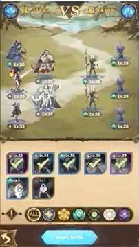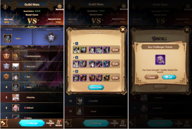 The battles themselves are asynchronous and offer an interesting twist to the core game. Each battle in a Guild War is a three round battle of three different formations. Think of it as three waves of heroes per player with each wave pitted against each other instead of surviving wave staying on the battlefield.