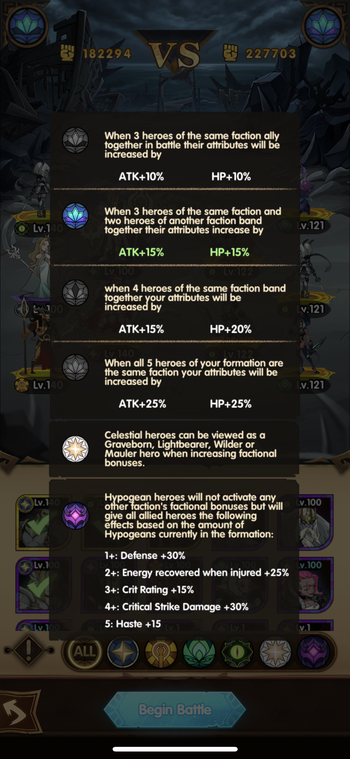 What’s interesting is that AFK explicitly incentivizes a flat team make-up more than most. As seen above, getting a team together of 5 of the same faction creates a damage and health bonus of 25%, enough to offset the bonus damage by a countering type (or give an additional incentive to have a team of 5 for each faction type). The game is less about trying to discover what the best team is, and more explicit with what it wants you to do: have multiple teams with all members being from the same faction. This is far more heavy handed than most western turn-based-RPG.