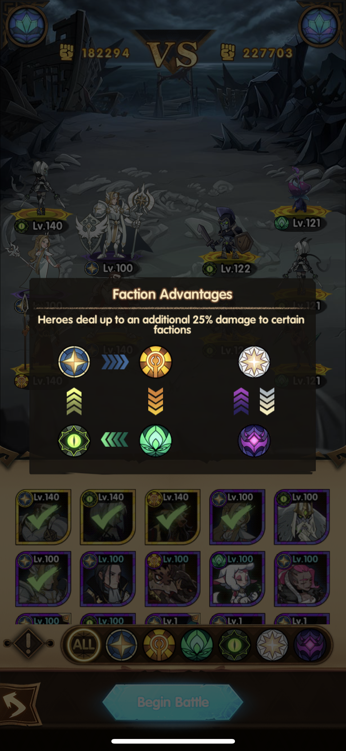 Besides statistical advantage, the game has a pretty basic element system. 6 faction types, which give a 25% bonus. This is pretty meagre in comparison to the competition. Contest of Champions have 7 types offset from each other, Galaxy of Heroes has a library of tags, Fire Emblem Heroes has 3 major types with 3 minor types each making 9 overall factions in comparison. Their faction system is good, but more complexity here could help them create more pressure to have a wider collection.