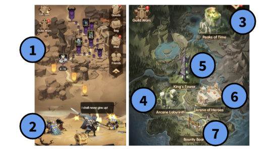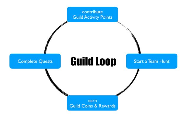 The Guild loop pushes the player to actively play the game and complete all of the quests. By completing quests, players contribute Guild Activity Points, which are used to kick off Team Hunts. Team Hunts allow the player to earn Guild Coins, which they spend in the Guild Store to purchase better gears for their heroes.