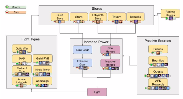The game features a very complex economy in which the same things can be obtained in many different ways. Heroes, for example, can be gained from feeding the gacha with either Diamonds or Scrolls, but also with Friendship Points, Hero Shards (as fragments) or bought in one of the 5 ingame stores with specialized currencies. As you can see from the detailed model, there is an abundance of currencies and interchange going on (we’ve grouped them together for better overview).