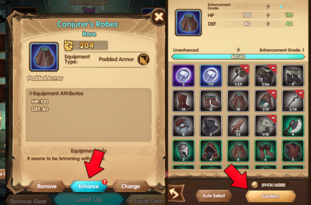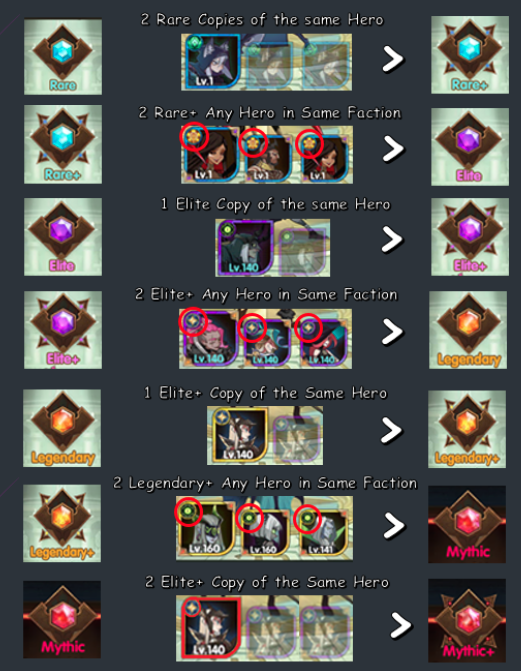 Both Heroes and gear use the classic pyramid system in which they are upgraded by fusing lower versions into the better one.