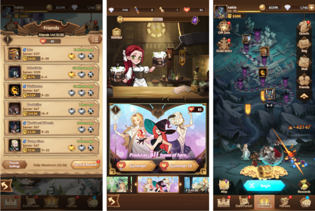 Overall there isn’t a lot differentiated about the core loop or battle in comparison to other turn-based-RPG on the market. AFK simply took the best bits of the category (ex. Gauntlet Modes, hero Sets) and pulled them earlier in a player’s progression. Lilith then removed some of the pain points of the genre: opting for a more automated battle to get rid of the pain of grinding, and put in an automated income source to pull the players back between sessions.