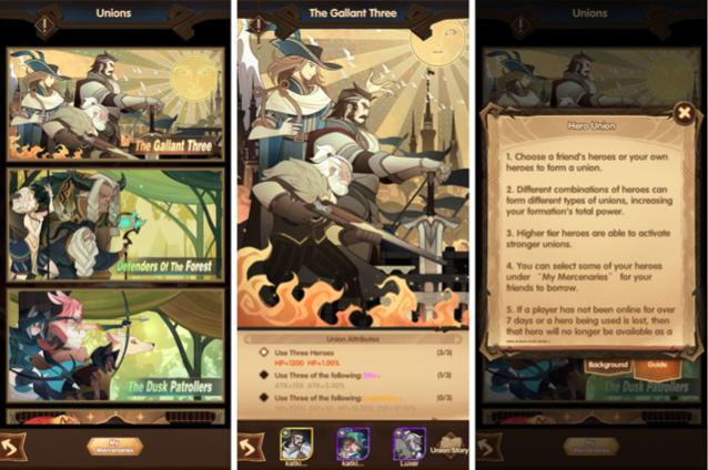 Another benefit of Friends is that you can use their heroes to form Unions in the Library and receive Unions buffs. There are three different levels of buffs a player can acquire from each union. The first level buff requires three of prescribed heroes. The level of buff increases as player has more rare heroes in a Union.