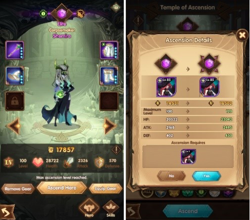 This “ascension gate” will constitute a critical moment in the monetization lifecycle of the player: until players get enough dupes to ascend the level caped hero, they simply can’t expect to progress. But ascending a hero will only provide a moderate boost to stats – and ascending will not increase the hero’s level. The underlying drive is that heroes need to be levelled up to progress significantly.