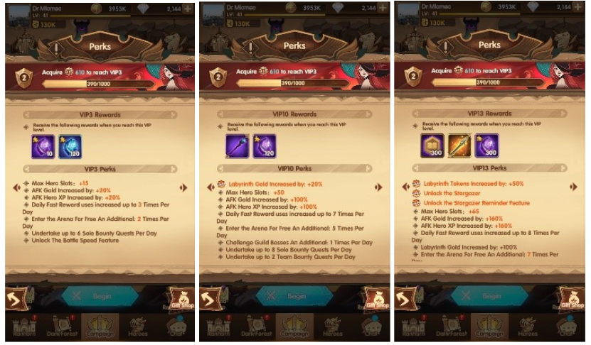 Higher VIP level gives not only significant passive bonuses, such as bigger rewards from AFK Timer or larger amount of Hero slots but also gameplay bonuses, such as ability to speed up the battles.