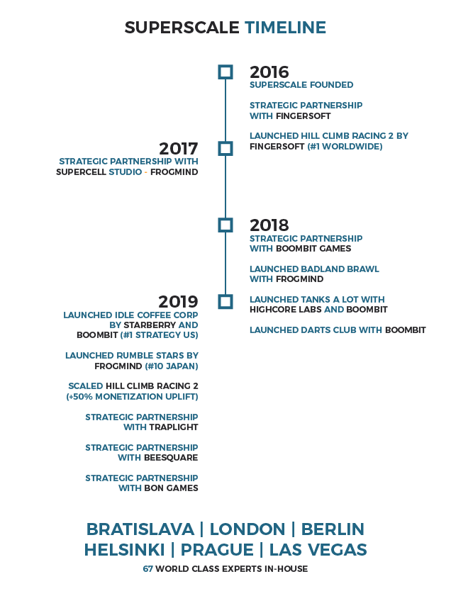 SuperScale is a team of 65 game ‘scalability specialists’ across Europe (London, Helsinki, Berlin, Prague, Bratislava, Warsaw) and US (Las Vegas) with upcoming Asia operations. The company’s structure is very flat comprising of only team leads with their team members.