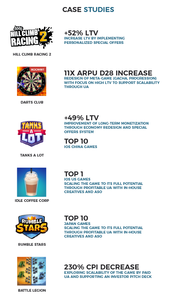 The goal of SuperScale is to be the strategic growth partner for game developers and publishers of any size that have a game, which data proves to be scalable. But don’t get it wrong. User acquisition, store optimisation and creatives development is only a part of SuperScales offering. In addition to helping its partners to decrease their CPIs, SuperScale also helps games to raise their LTV. Building of analytics infrastructure, improving monetisation design, optimising ads and making distribution deals outside the conventional app stores are all part of SuperScales service portfolio.