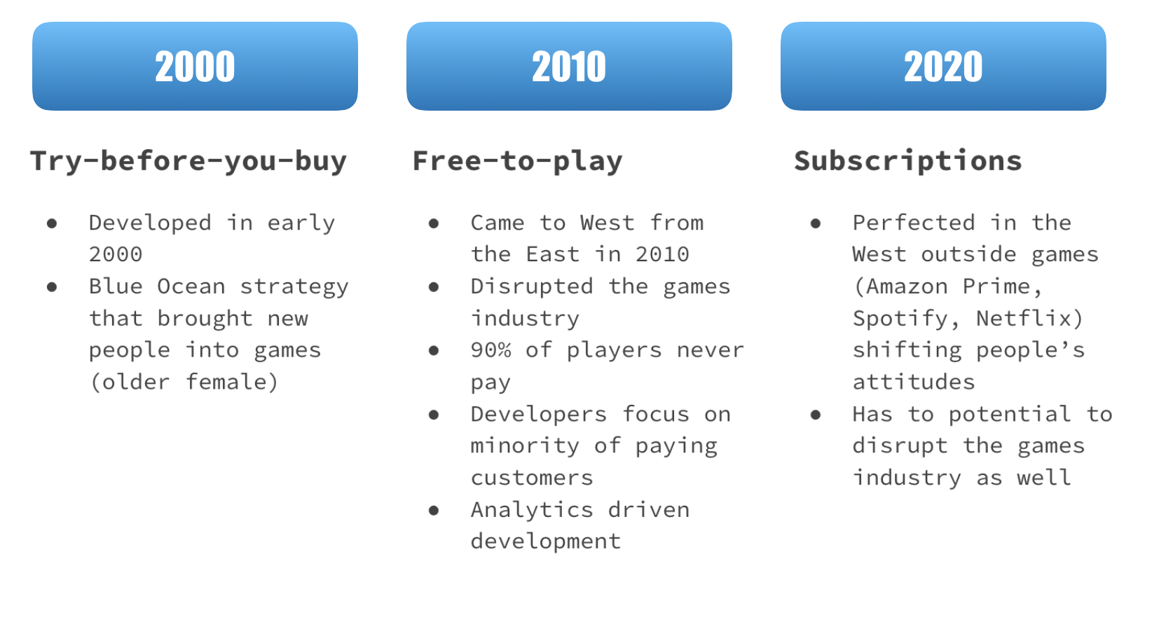Given the impact of free-to-play and the millionaires it, everyone has been looking for the next disruptive business model. Based on how other industries are evolving, subscriptions are likely to be the next disruptive model in the game industry,