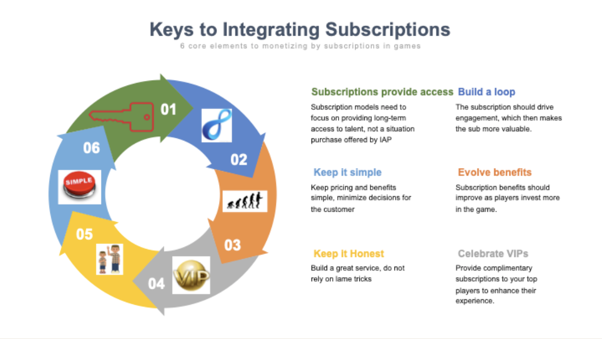 Successful subscriptions also need to build an honest relationship with players, provide simple options, create a loop where subscribers enjoy more benefits by playing more, appeals to new potential customers and rewards your VIPs.