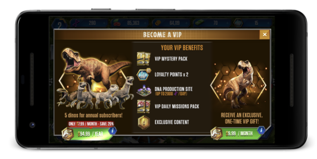 Another important element of a successful subscription program is that benefits evolve. According to Google, “as the players invest more in the game, whether it’s with their time, skills, or other IAP, the subscription benefit also compounds.” Thus, the player can unlock more sophisticated content or new challenges that would not have been relevant for them earlier in their experience.