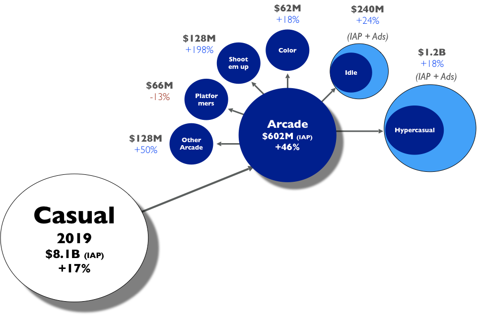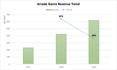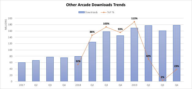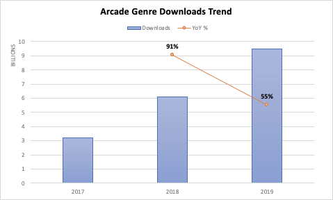 Over 2019, Arcade YoY Downloads went from 6.1B to a whopping 9.5B, continuing its double-digit growth rate from 2018 with +55% YoY. While 70% of this growth is driven by Hypercasual game downloads, 2019 did see a lower YoY growth rate compared to 2018 because Hypercasual growth did not accelerate at the same pace.