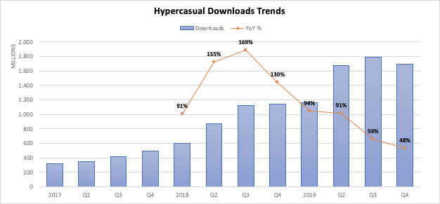 2020 Prediction #1: Hypercasual downloads will continue its YoY growth rate decline through 2020 and major publishers will focus on two things -