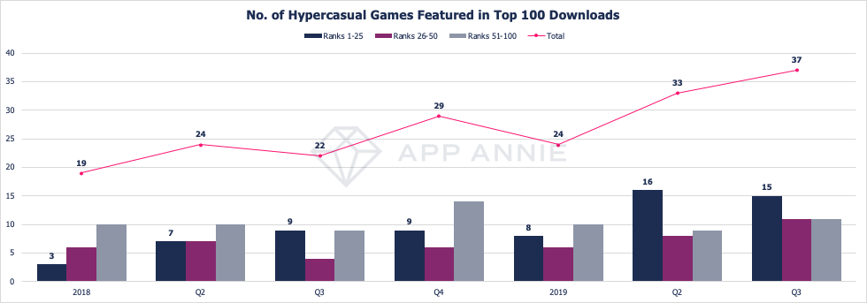 The number of Hypercasual titles in the Top 100 download charts, and more specifically the Top 25, has never been higher. This is the major driver for the huge Q2 2019 downloads market size spike.