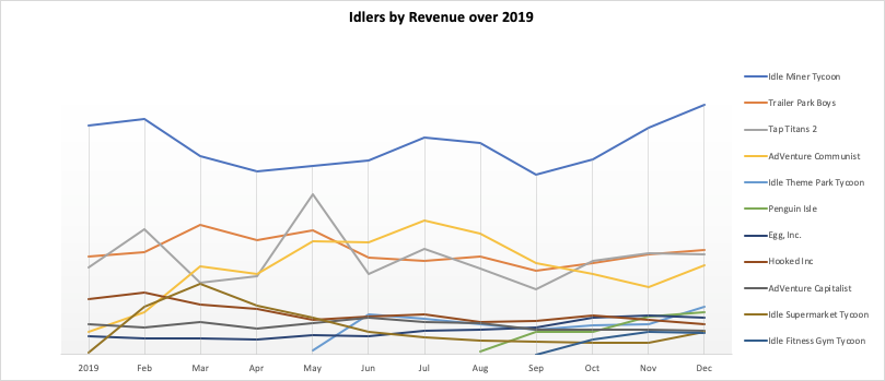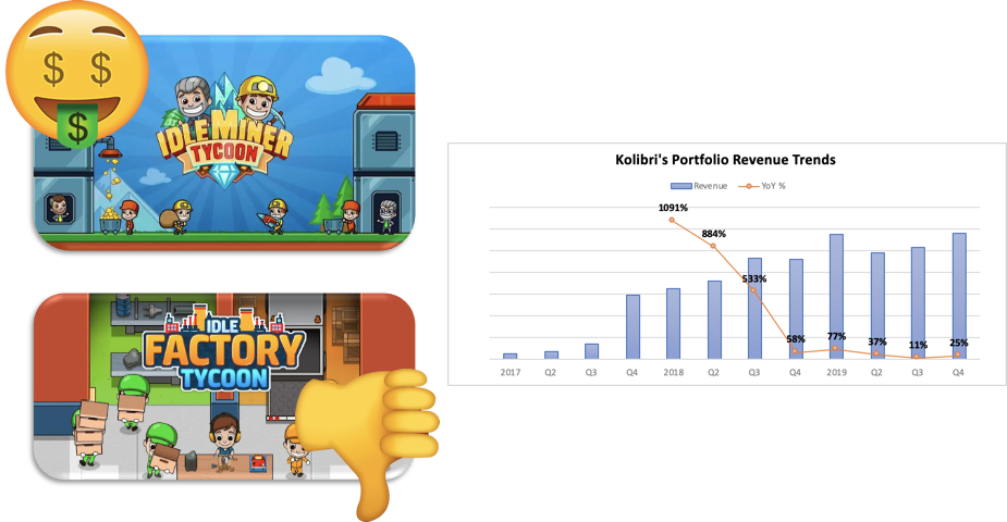 From a market share perspective, not much has changed when it comes to key competitors in market. Kolibri continues to rule at 25% market share with their smash hit Idle Miner Tycoon, which is also the company’s sole cash cow. Their second game (Idle Factory Tycoon) has flopped, even though the team tried really hard to turn this one around with some very large game design changes. All this has resulted in Kolibri’s portfolio revenues taking a major YoY growth rate beating with a 77% YoY growth rate at the start of 2019 dropping to 25% by the end of the year. This could mean major changes in the company’s future, as Idle Miner Tycoon cannot mine gold forever.