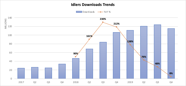In 2019, Idle games saw double digit growth rates with annual Downloads hitting ~470M (+54% YoY) and annual IAP Revenue at ~$111M (+23% YoY). On a high level, Idlers can be categorized into three revenue buckets -