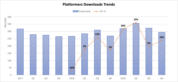 2020 Prediction #1: Jumping and running is a universal play pattern that’s here to stay. We predict no major change to downloads, as Platformers continue getting nice traction throughout 2020.