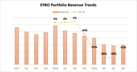 SYBO’s portfolio revenues have massively dropped over 2019 with YoY IAP revenue growth rates plateauing between -30-40% between Q2-Q3 2019.