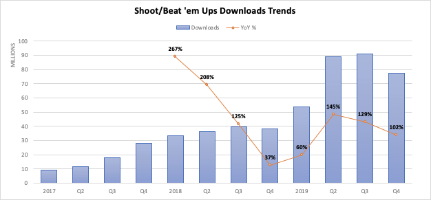 Shoot’em Ups (Shmups) saw a big upset last year that can be summarized in one word: Archero. If the arcade phenomenon of 2019 needs an introduction, check out the extensive analysis we wrote up last year - How Archero Shot to the Top, and How You Can Do Better. Driven primarily by Habby’s innovative Roguelite ($73M revenue in 2019), Shoot’em Up yearly Revenue grew to $128M (+198% YoY) with Downloads at 296M (+125% YoY).